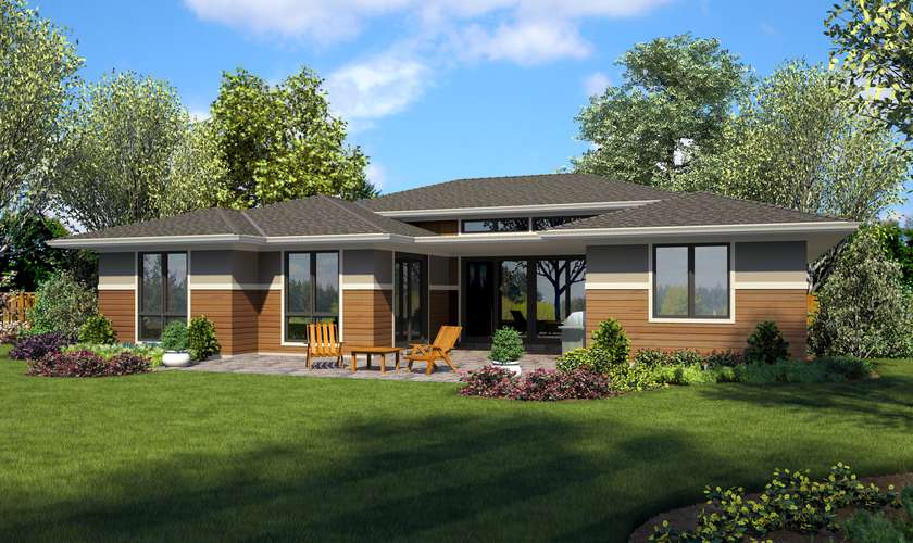 Our Prairie style houseplans feature a low pitched roof, usually hipped, with a wide overhang, and have boxed shapes with a horizontal emphasis. They typically feature clean lines with massive square porch supports, and casement windows in rows. Frank Lloyd Wright revolutionized the American home when he began to design "Prairie" style houses characterized by low, horizontal lines that were meant to blend with the flat landscape around them. Our collection of Prairie Style homes exemplifies the style-- mixing timeless architectural elements with modern convenience, resulting in a wonderful home built to withstand the ever-changing 'vogue' of modern styles.
