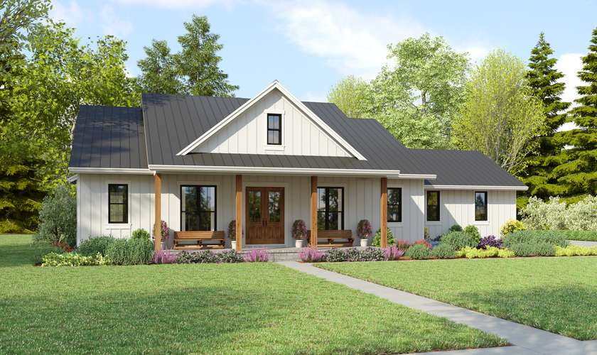 This home features in our Farmhouse plans collection. Farmhouse is a general term for the main house of a farm. It is a type of building or house which serves a residential purpose in a rural or agricultural setting. Most often, the surrounding environment will be a farm. Many farm houses are shaped like a T. The perpendicular section is referred to as the ell. Architectural styles vary, but very often they are of Cape Cod design. In general styles vary from region to region, but more often the style is simplistic so to serve the needs (and the budget) of the owners.