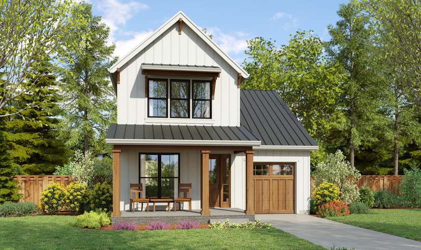 Adds a 2 car front facing garage. The garage will be 23/6 wide by 11/6 deep, and will make the overall width of this home 38'-0"