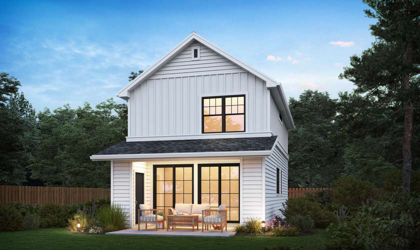 This narrow lor home maximizes use of available space where practical, while minimizing costs with a focus on efficiency. The laundry and kitchen plumbing is centrally located with upstairs bathrooms, so you don't have to worry about extensive plumbing runs. The office can double as a third bedroom or other flexible space, and there is ample room for guests and parties with a peninsular bar and open great room dining area. Upstairs, each bedroom has a walk-in closet, and bathroom amenities.