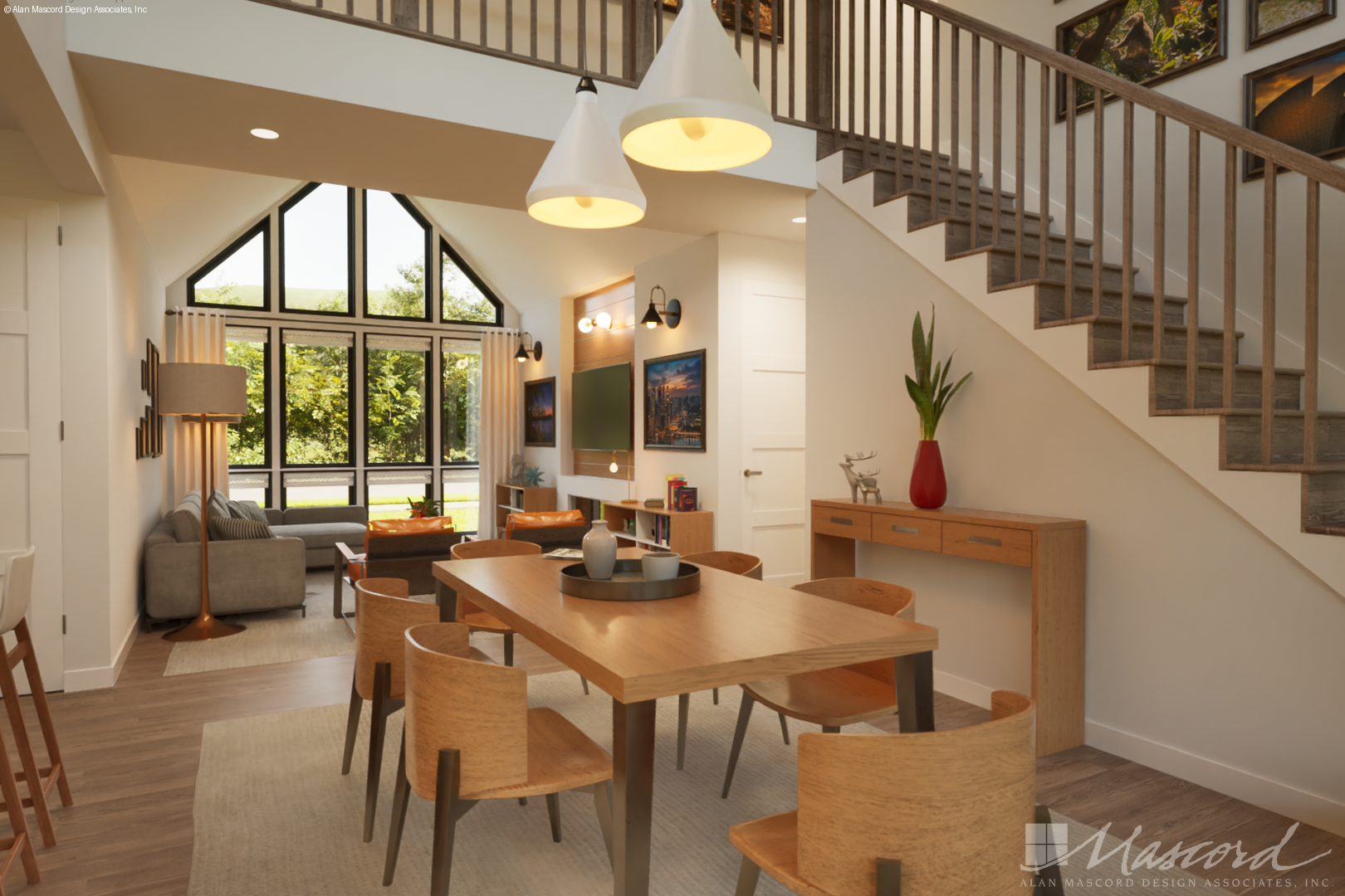 Elevated Main Floor Livability Designed for both breathtaking entertaining and comfortable, light-filled daily life, the main floor boasts a brilliant open-concept layout. You are welcomed via a covered front porch into an inviting entry, flanked by a dedicated, private home office—perfect for remote work. The heart of the home is a spectacular vaulted living room that effortlessly transitions into a dramatic two-story dining space, ensuring the interiors are flooded with abundant natural light, a hallmark of Nordic design.