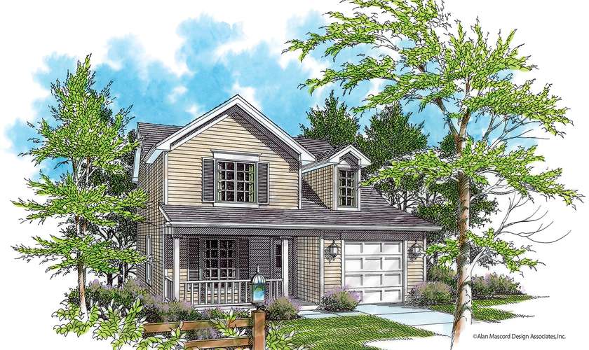 It's not easy to find smaller plans that have a floor plan as well-designed as this one. It includes both formal and informal spaces, and a variety of additional amenities that are common only in larger homes. A covered porch begins the plan and opens directly to the formal living/dining room combination. The space is large enough for a full suite of furniture and a traditional table with plenty of chairs. Casual gathering space is at the back of the plan: a family room with fireplace, a breakfast nook with sliding glass doors and the U-shaped kitchen. Just off the family room are the laundry and a powder room. The single-car garage has an access door here. Bedrooms on the upper level accommodate the whole family. Bedrooms 2 and 3 share a bath, while the vaulted master salon has a private bath with compartmented toilet and shower.