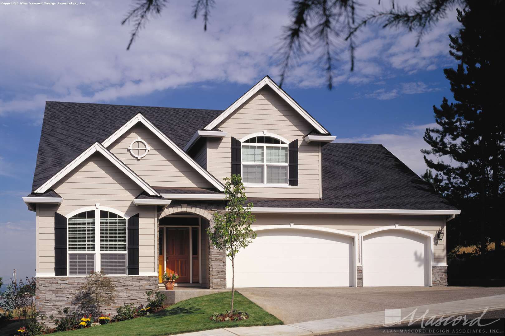 Country at heart, this charming cottage-style home would be equally comfortable at the seashore, on an acreage, at the edge of a woods, or in a friendly city neighborhood. Inside, rooms flow together, creating a formal entertainment center and a more casual family area. For quiet times, a front den can be closed off by double doors. Play host to a few or many in the formal living and dining rooms, separated by a pair of columns and a change in ceiling height. A coat closet beneath the staircase and a powder room are conveniently located for guests. The wide-open spaces extend to the kitchen and family room, furnished with a fireplace. From the sink peninsula, the cook can view the back yard or hobnob with everyone in the breakfast nook and family room. The upper level accommodates private rooms-three bedrooms and a master suite. The master bath houses a shower, whirlpool tub, and a toilet compartment. The loft is enclosed by a half-wall that overlooks the living room. Furnish the loft as a sitting area, a library, or playroom. This home plan allows for either a two- or three-car garage; plans for both are included. With a three-car garage, bedroom four gains 98 square feet.