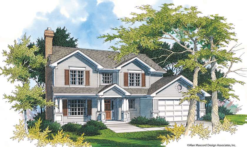 Superior floor planning gives this design great livability in a modest square footage. Dressing up the facade, a full-width covered porch, with turned pillars and central pediment, lends a light country touch. A sidelit entry opens to a central hall with coat closet. Living and dining rooms are on the left; a laundry room and half-bath are on the right. The living room is warmed by a focal-point fireplace. The nook, family room and island kitchen form an open casual space at the back. A fireplace in the family room warms the entire area. The kitchen is made convenient by a built-in desk and large pantry, while sliding glass doors in the nook open the area to the backyard. The upper level holds four bedrooms (or make one a den) and two full baths. The master bath features a walk-in closet, dual sinks and a spa tub. Bedroom 4 has a walk-in closet.