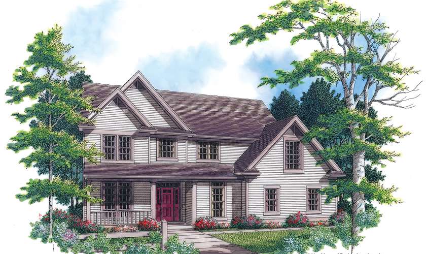 An engaging farmhouse with Colonial overtones, this two-story plan is not only roomy, but offers expansion space. The floor plan is designed for family living, with both formal and informal areas. A den with double doors sits on the right side; the living and dining rooms on the left. At the back find a family room, with corner fireplace, and an island kitchen with breakfast nook. A pantry and a built-in desk are highlights in the kitchen. A half-bath serves the hallway entry to the two-car garage, which features space for a workshop. The upper level allows for four bedrooms, one of which is a master suite with private bath. The laundry is also located on the upper level, as is a huge walk-in linen closet. Develop the bonus room into an additional bedroom or use it simply for storage.