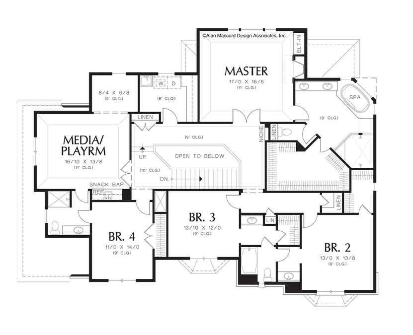 A stone façade - so stately, so lasting. And the perfect complement to this timeless design. Main-level rooms begin with a formal dining room and a den flanking the entry foyer - both with bay windows. The den has a built-in desk and bookshelves. A gigantic great room is at the back. It is appointed with a fireplace, built-ins and a wall of glass. The nearby nook opens to a covered patio and adjoins the island kitchen. The service hall features a half-bath and closet and leads to the triple garage with workshop or storage space. Note that main-level rooms have ten-foot ceilings. The upper level holds four bedrooms and a media center or playroom with snack center. Bedrooms 2 and 3 share a bath, while Bedroom 4 has a private bath. There is also a private bath in the master suite--and what a bath it is! There's a corner spa tub, separate shower, compartmented toilet and double vanity. The master salon contains a fireplace and built-ins. Thoughtful placement of the laundry on the upper level is an especially nice touch. Upper-level rooms have nine-foot ceilings, except the laundry (eight feet) and the playroom and master salon (eleven feet).