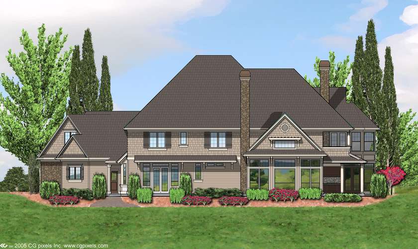 This home, with its European country touches, denotes the feel of a casual estate where all your needs are met. With over 6,000 square feet of living space, the features are indeed plentiful. Yet, the floor plan is refreshingly versatile. To begin with, the home offers two master suites - one on the main level and one on the upper level. One of the suites could be designated for a live-in relative, or the owners could plan to use the upper-level suite - which has more lavish features, such as a bay sitting room, walk-in shower, and dressing closet with a built-in two-sided dresser - until their later years, when single-level living has more appeal. Moreover, one of the suites could even be saved as a self-contained guest suite for frequent out-of-town visitors. Between the large, sun-filled breakfast nook, the formal dining room, and the circle-shape snack bar, the floor plan features plenty of dining space, so huge family dinners are easily accommodated. Dining space in the breakfast nook even extends outside to a patio, which features a built-in outdoor kitchen and barbecue area. A den, located across the foyer from the formal living and dining room, can be fashioned as a secluded retreat, or tailored to the needs of a work-at-home professional. Front and side entrances lead into a large mudroom with storage cubbies, closets, and a clean-up sink so the main parts of the home can stay tidy. A bonus space and hobby room above the garage also can be developed into specialty spaces, such as a home theater, a game room, a teenager hang-out, and a child's playroom.