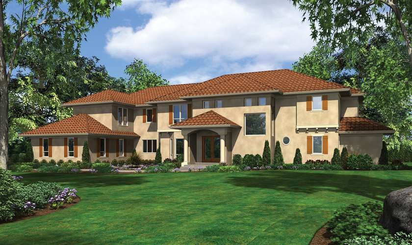 Our Mediterranean style house plan collection includes Spanish, Tuscan, Mission and Italian style homes. They typically have a low pitched or flat tile roof. There are arches at doors, windows and porches. Balconies feature ornamental ironwork. Exteriors are finished in stucco or masonry with terra cotta paver trim.
