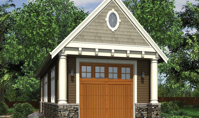 This garage/storage and utility space features a bathroom, washer/drier, garage doors glazed with grilles and panels, a transom window over the entrance, decorative stonework, lap siding and a handsome dormer window.