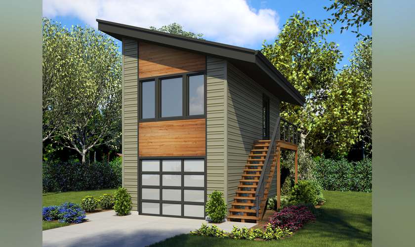 Everything in this contemporary home is designed to maximize space and keep costs low while still including key amenities in a stylish way. With its clean lines and modern design, this versatile building works wonderfully as a guest house, tiny house, or studio. The ground floor offers a big garage for one vehicle and plenty of storage. The second floor is a beautiful studio apartment that feels spacious due to vaulted ceilings. The ceilings are high enough that the space feels like a loft.