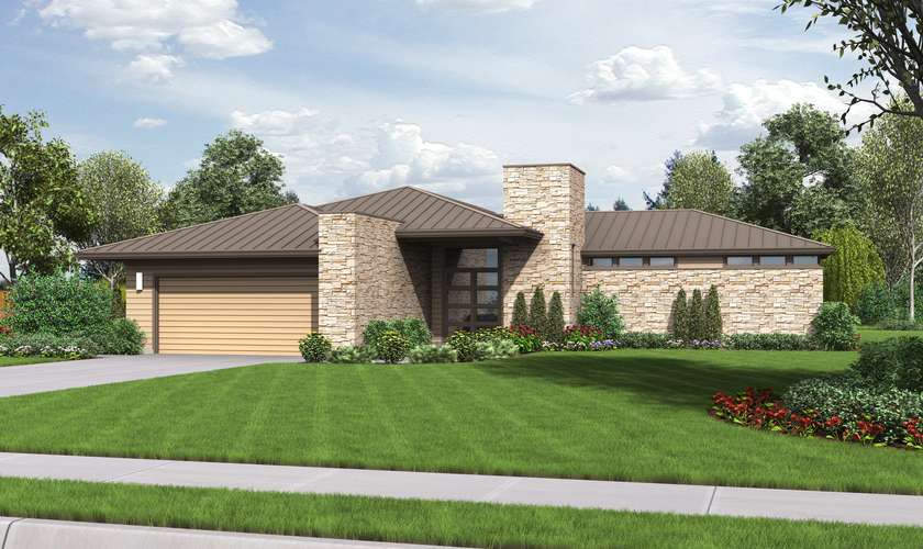 This stunning one-story home design features clean lines and lots of stone and glass. The rear of the home provides plenty of connection with the outdoors via numerous French doors and a patio living/grilling space. Some of the rooms also have high transom windows, set above stone or above French doors. The home’s exterior is sure to be the talk of the neighborhood, since it is unusually bold and attractive.