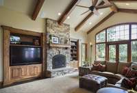The Westfall’s great room is a beautiful vaulted space, with gorgeous exposed beams. It has a fireplace with built-in bookcases on each side. Huge panes of glass on either side of double doors lead to a back porch; arched multi-pane windows above add even more natural light. An open floor plan (typical of Ranch house plans) combines the great room, kitchen, and dining room into one big “family triangle,” with no walls to cramp the space.