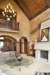 This design's prominent front gable with decorative wood braces and two-story turret recall both Tudor and French Normandy influences. The elegance of these styles also is reflected on its sprawling interior. The turret houses a beautiful circular staircase, which becomes a focal point in the foyer that is visible from the nearby dining room and great room. Heavy posts delineate the open formal rooms of the dining room and great room, providing visual separation without obstructing views or traffic flow. The great room offers a fireplace flanked by built-in cabinets. An open passageway leads to the breakfast nook and kitchen. The kitchen will be a destination for guests with its built-in aquarium in the snack bar island and its heavy wood beams accentuating the ceiling. Wine lovers will appreciate the ability to peruse the walk-in wine closet just down the hall. Accordion-style glass doors along the kitchen's rear wall open to the back porch and a covered outdoor living area with a fireplace. A large recreation room plays host to casual entertaining and everyday family fun. Spacious enough for several games tables, it provides a wet bar, a fireplace, and a gazebo-style card room. The opposite side of the home houses the master suite, which has a large dressing closet with an island and a pair of windows that bring in natural light. A fireplace warms the bedroom and sitting area, while built-ins provide storage for a television, books or collections. Windows at the rear of the bedroom and sitting area fill the space with light. Built-ins distinguish the home office and provide plenty of storage. A fireplace and large picture window make handsome counterpoints to the cabinetry. At the top of the circular staircase, a hallway leads to four upper-level bedrooms. All the bedrooms feature built-in desks and bookshelves. Pairs of bedrooms on each end of the upper level share baths divided into compartments, an arrangement which allows more than one person to use the bathrooms at the same time.